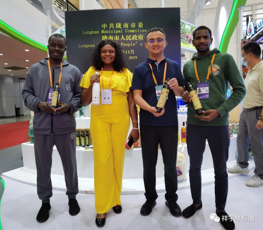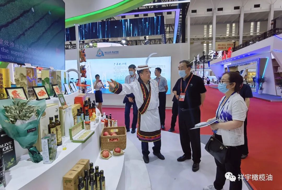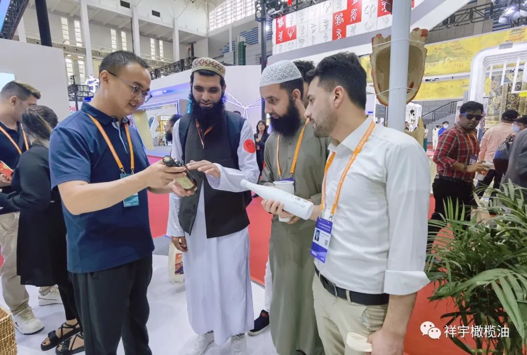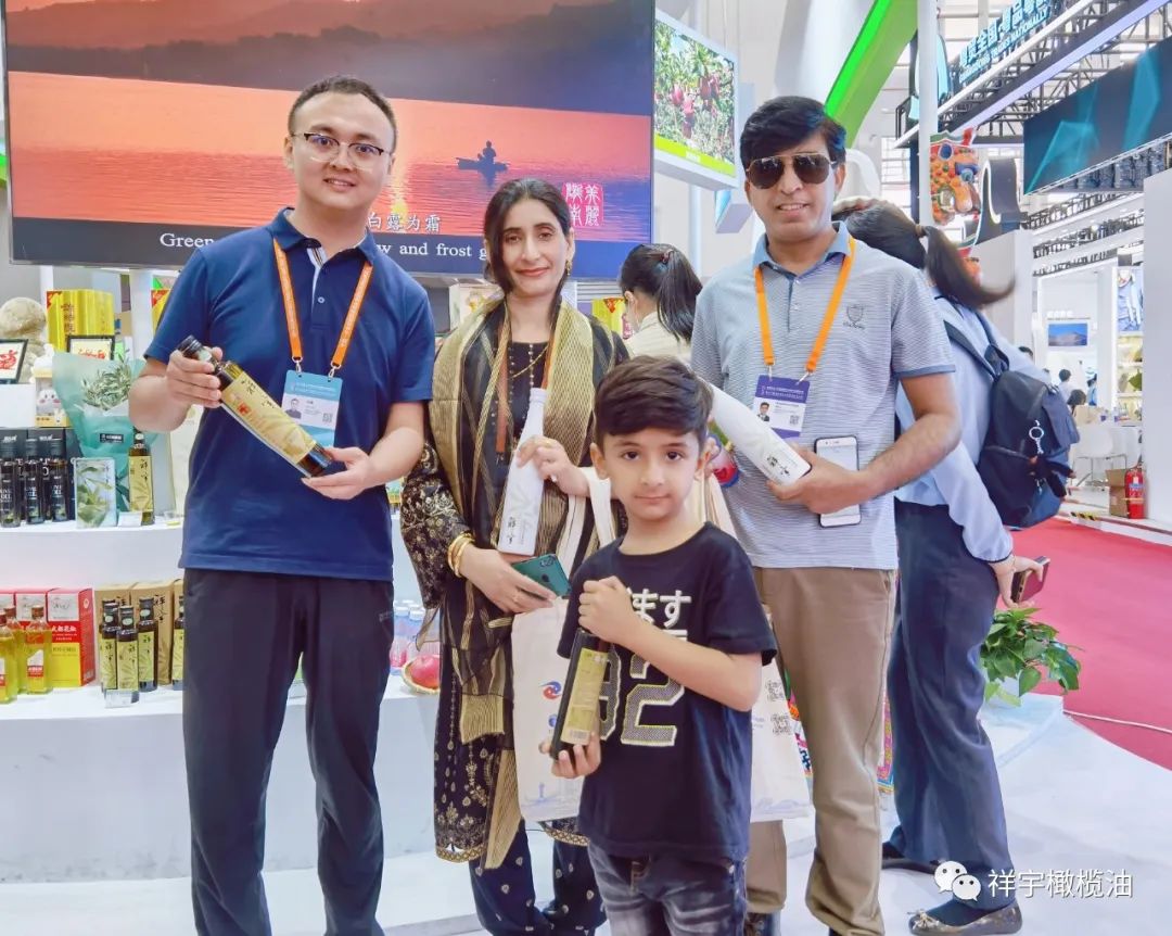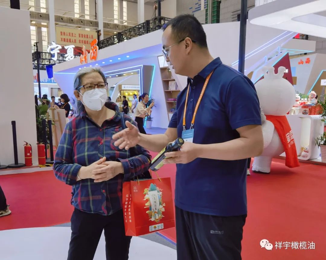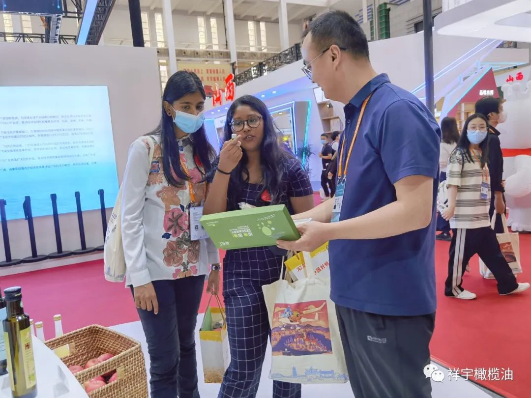 展會(huì)現(xiàn)場(chǎng),來賓、客商紛紛到祥宇橄欖油展臺(tái)前駐足品鑒,