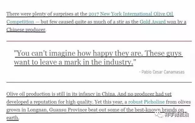 譯文:在2017屆紐約國際橄欖油大賽上驚喜不斷,但卻未曾出現(xiàn)過中國原產(chǎn)的橄欖油獲得金獎這樣的轟動。