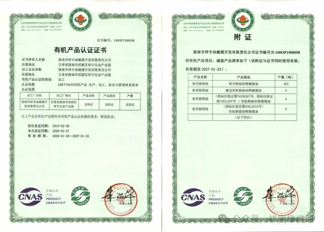 祥宇橄欖油自有萬畝有機種植基地,從橄欖樹種植、鮮果采摘,到壓榨、灌裝、銷售,全程可追溯,每一滴都能查到源頭。
